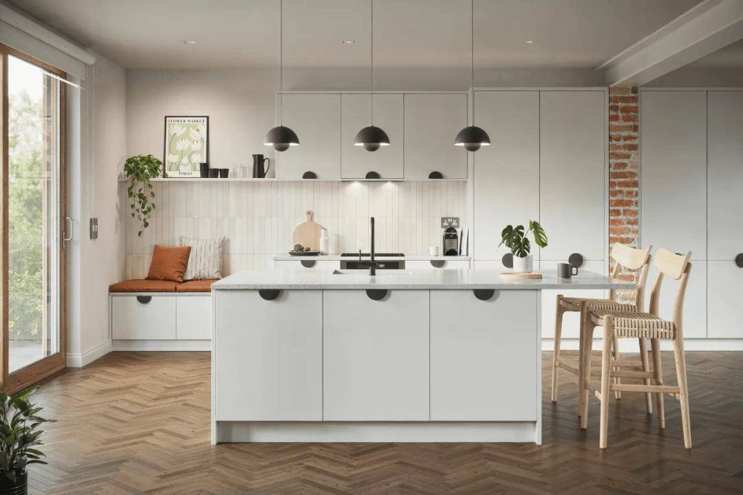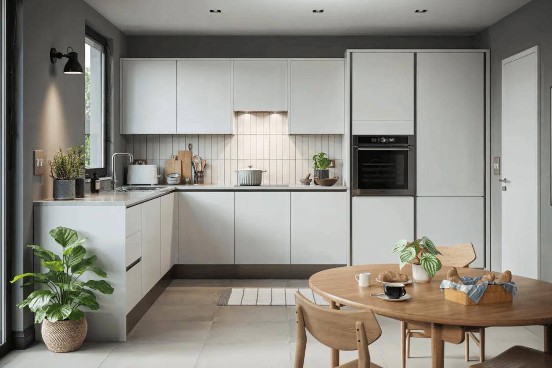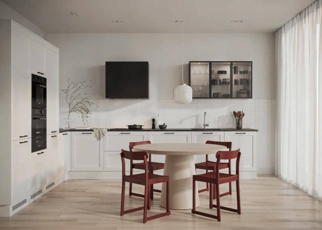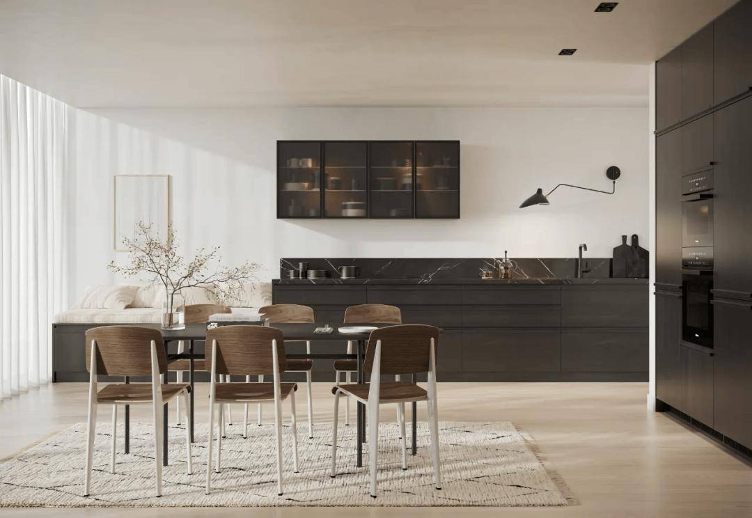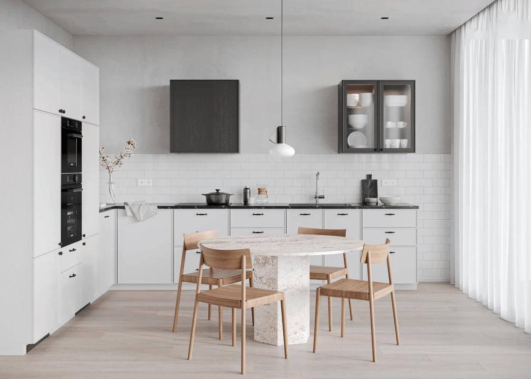 喜欢简约高级?可以选 “灰白撞色款”,浅灰柜体配白色吊柜,搭大理石餐桌,清冷又精致;或是 “奶白极简款”,通体浅白 + 细条瓷砖,温柔感拉满。