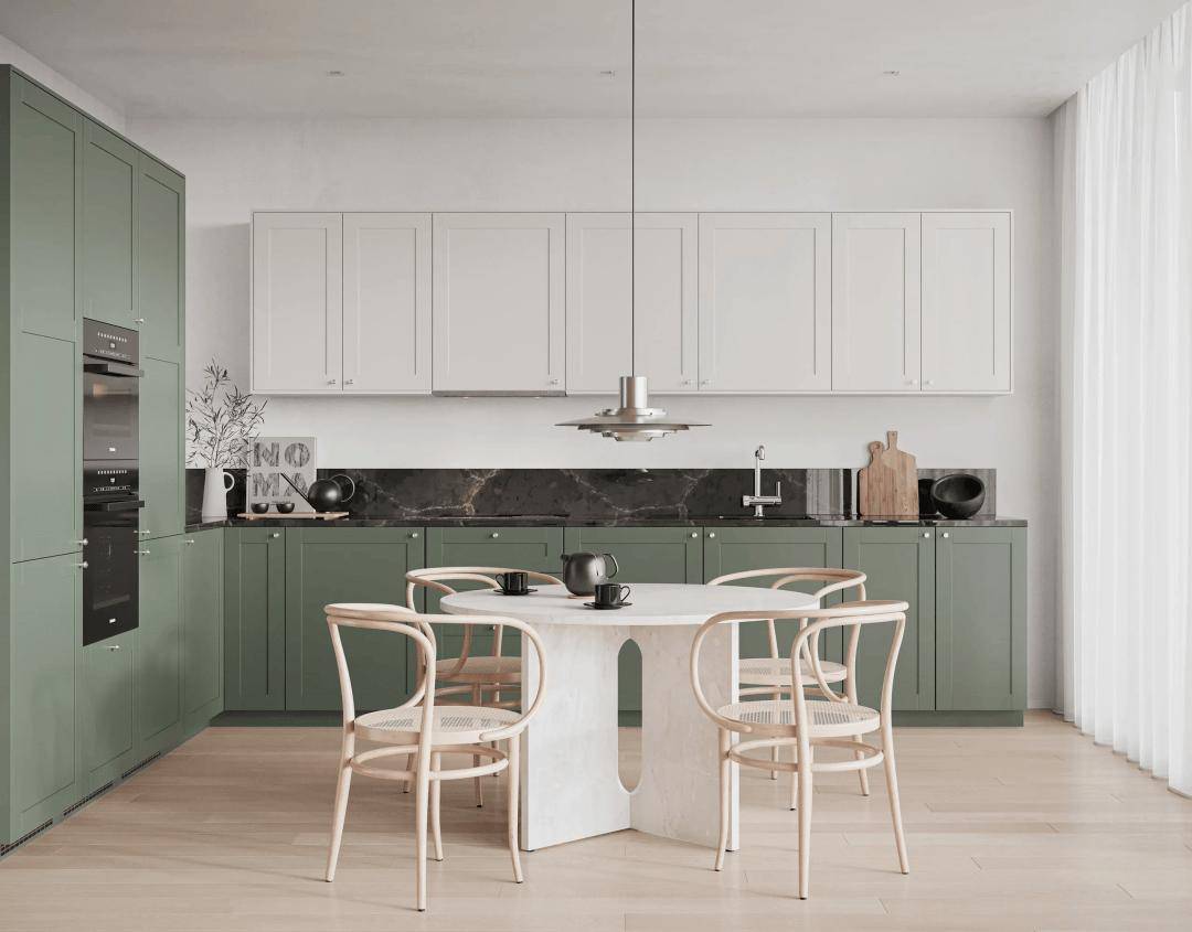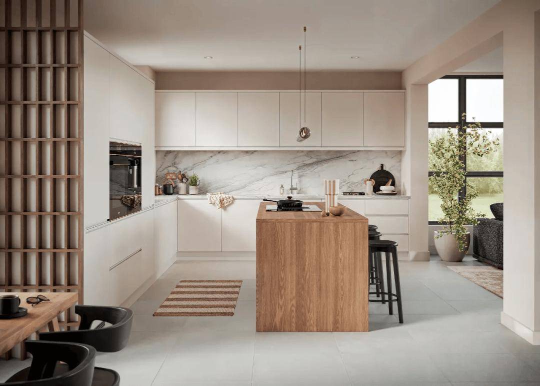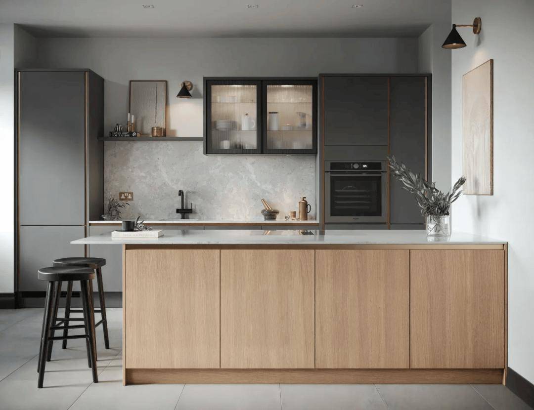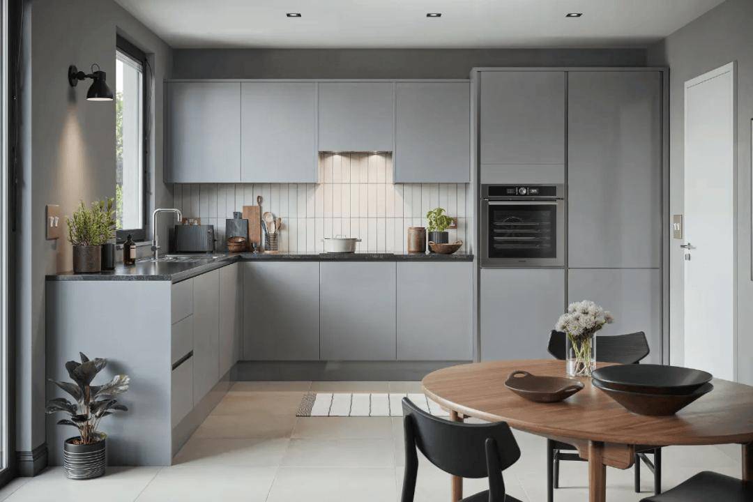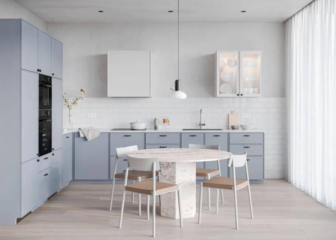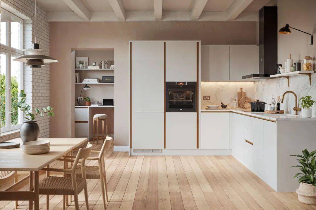 喜欢简约高级?可以选 “灰白撞色款”,浅灰柜体配白色吊柜,搭大理石餐桌,清冷又精致;或是 “奶白极简款”,通体浅白 + 细条瓷砖,温柔感拉满。