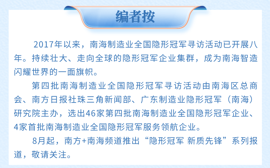 这家冠军企业将继续扎根南海发展。“对我们来说,获评‘隐形冠军’是对过往辉煌的见证,更是未来征程的起点。”曾繁汇说,南海成熟的产业链条为企业研发创新提供了坚实基础,政府高效的服务态度也为企业申报“隐形冠军”等事项提供了有力的支持。