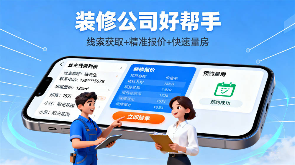 装修接单通:3D预案+即时响应装修接单通以“在线量房+3D全景预案+即时报价”功能为核心,将传统3天沟通流程压缩至2小时。