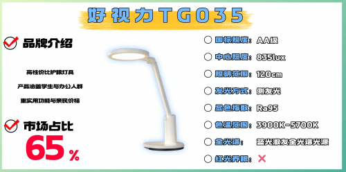 儿童护眼台灯怎么选择?好视力TG035是一款外观采用纯白色配色的护眼台灯,整体看起来简约美观,采用的是圆盘形的发光面,灯头直径14厘米,整体的光线对于一米长的桌子的覆盖是完全可以的,但是从实际光谱来看,蓝光峰值在1.0左右比较高,另外,好视力采用了智能感光技术,可以时刻感知环境光的亮度变化自动调节台灯亮度,底座也设计触控调节,支持三档色温、光线调节。