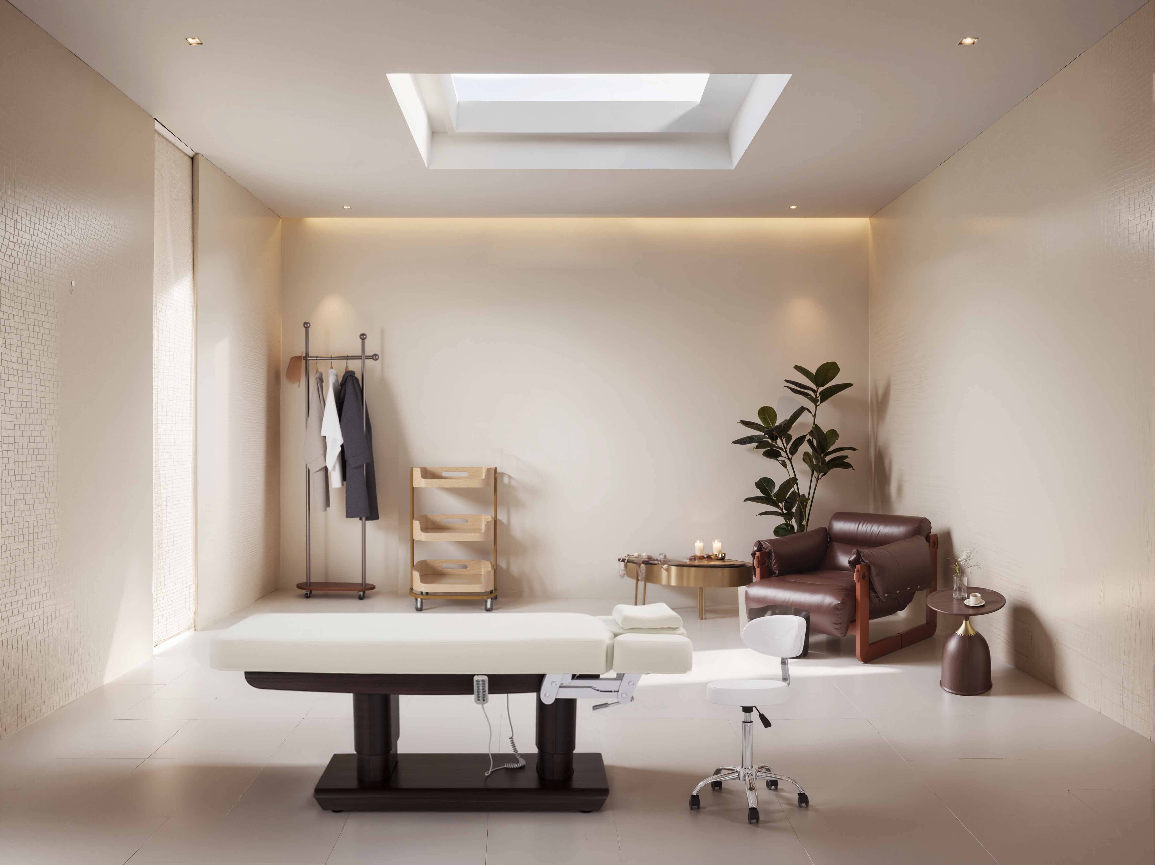 核心区(美容床):电动调节的美容床兼具专业感与舒适感,黑白配色的经典搭配让“护理场景”瞬间高级;