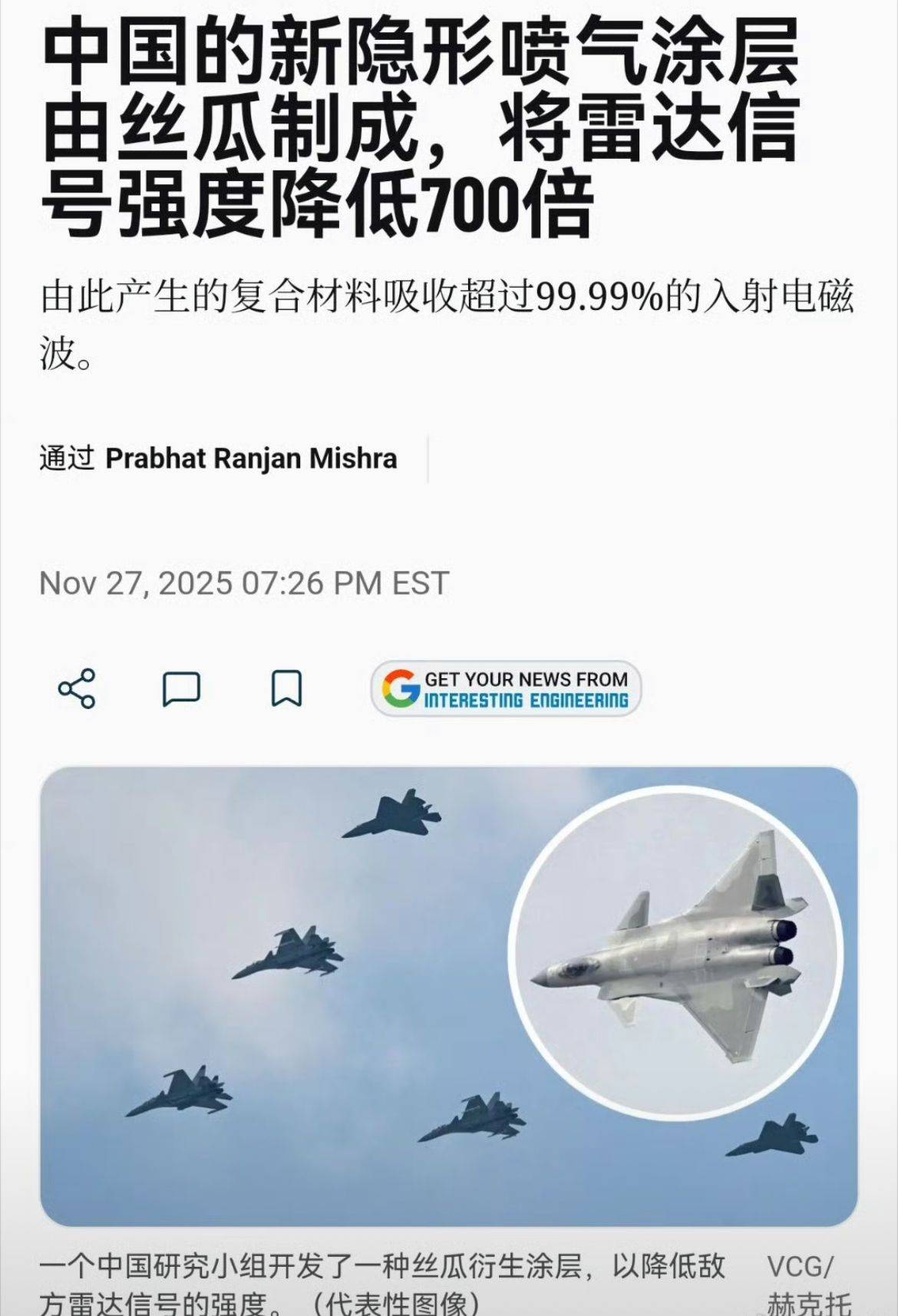 中国瓜农可能要被美国制裁了,这可不是危言耸听,最近外媒报道称,中国科研人员利用丝瓜造出了一种吸波涂料,具体做法是先将干丝瓜变成碳,然后加入镍钴氧化物(NiCo204),变成了一种磁性纳米颗粒,这种吸波涂料能够吸收绝大部分电磁波,将飞机的RCS降低700倍。