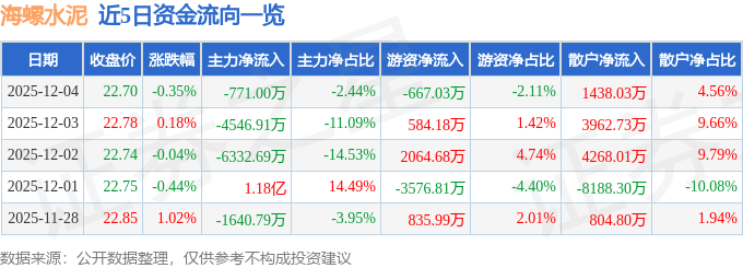 证券之星消息,截至2025年12月4日收盘,海螺水泥(600585)报收于22.7元,下跌0.35%,换手率0.35%,成交量13.89万手,成交额3.15亿元。