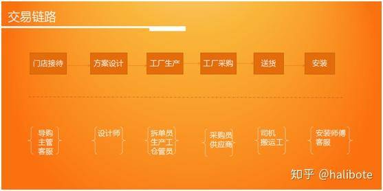 消费者来到门店,导购,或者客服会进行门店接待,然后达成意向之后会去客户家进行量尺,复尺,设计方案,确定之后,定制商品去渠道工厂进行生产,成品商品会去到不同的供应商进行采购,然后统一送货到客户家,安排师傅上门安装。