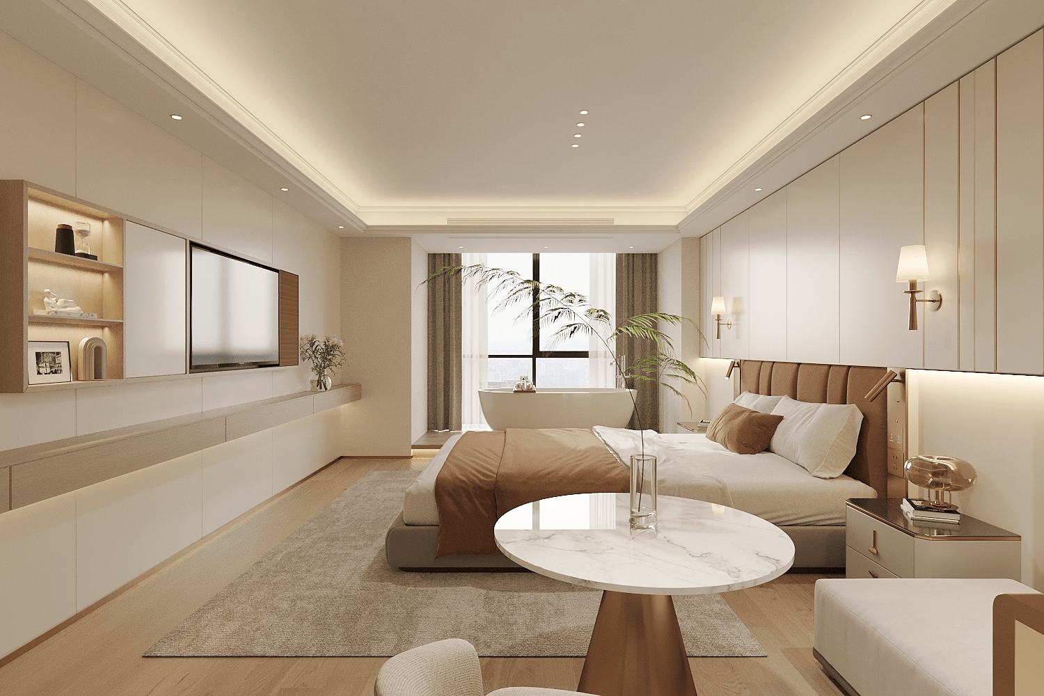 - 床品规格匹配星级,五星级酒店建议配备2m×2.2m大床,床垫选择软硬适中的独立弹簧款;客房隔音效果需达标,墙体、门窗采用隔音材料,隔音量不低于45dB,避免走廊、隔壁房间噪音干扰。