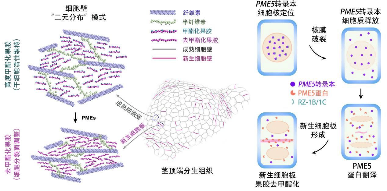 平常这个酶被巧妙地储存在细胞核中,“核心开关”处于关闭状态;只有在细胞分裂的关键时刻,“核心开关”才会启动,这个酶从细胞核中释放,精准投送到新生细胞壁位置,对其进行去甲酯化修饰,实现细胞壁局部“松软”。