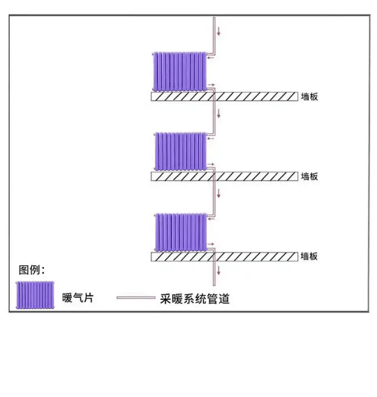 串联系统中,每组暖气片都并联着一根细一些的“跨越管”,旁边有调节阀门(可能是截止阀或温控阀)。它的作用是分流一部分热水,以保证有足够的热水继续流向后面的暖气片。