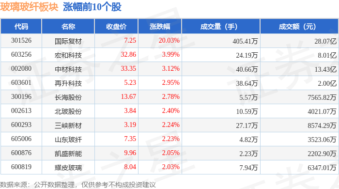 证券之星消息,12月5日玻璃玻纤板块较上一交易日上涨1.09%,国际复材领涨。当日上证指数报收于3902.81,上涨0.7%。深证成指报收于13147.68,上涨1.08%。玻璃玻纤板块个股涨跌见下表: