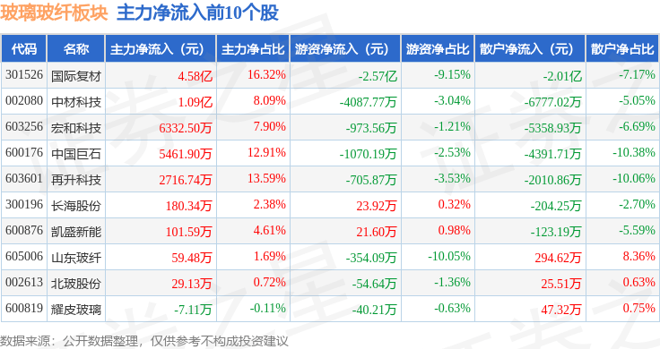 从资金流向上来看,当日玻璃玻纤板块主力资金净流入6.93亿元,游资资金净流出3.13亿元,散户资金净流出3.81亿元。玻璃玻纤板块个股资金流向见下表: