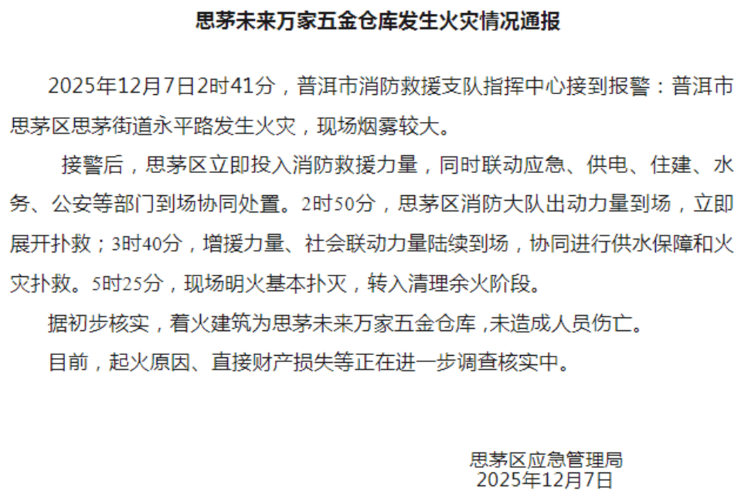 记者注意到,今天(7日)上午, 思茅区应急管理局针对此事发布了情况通报。通报称,2025年12月7日2时41分,普洱市消防救援支队指挥中心接到报警:普洱市思茅区思茅街道永平路发生火灾,现场烟雾较大。接警后,思茅区立即投入消防救援力量,同时联动应急、供电、住建、水务、公安等部门到场协同处置。2时50分,思茅区消防大队出动力量到场,立即展开扑救;3时40分,增援力量、社会联动力量陆续到场,协同进行供水保障和火灾扑救。5时25分,现场明火基本扑灭,转入清理余火阶段。