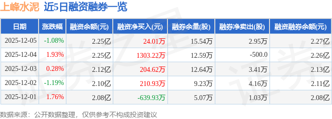 证券之星消息,截至2025年12月5日收盘,上峰水泥(000672)报收于10.95元,下跌1.08%,换手率1.57%,成交量15.2万手,成交额1.67亿元。