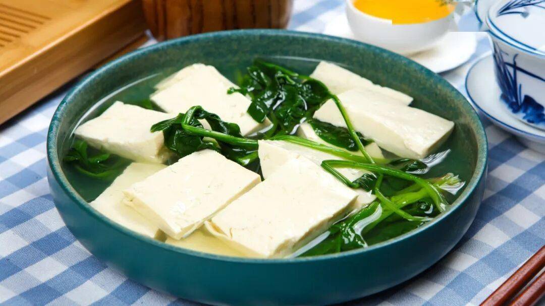 用料:焯水后的菠菜100克,内酯豆腐半盒,鸡蛋清1个,高汤或清水适量,盐、香油少许。