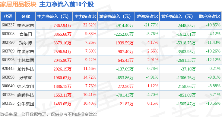 从资金流向上来看,当日家居用品板块主力资金净流入1.08亿元,游资资金净流入1.11亿元,散户资金净流出2.2亿元。家居用品板块个股资金流向见下表: