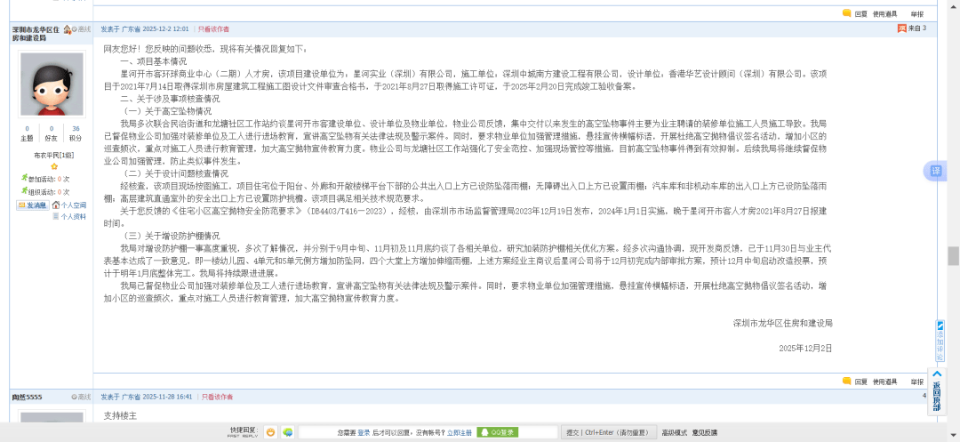 龙华区住房和建设局于12月2日回帖围绕三个主要问题作了更为详尽的答复。据该局答复称,星河开市客小区集中交付以来发生的高空坠物事件主要为业主聘请的装修单位施工人员施工导致。