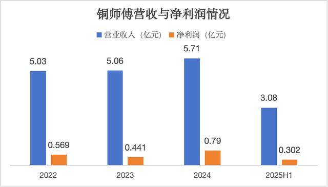 与泡泡玛特对比的落差不仅体现在规模,同样体现在赚钱能力。2022年至2024年,铜师傅的净利润连续三年未能过亿,2025年上半年的净利润相比2024年同期还减少了23.9%。