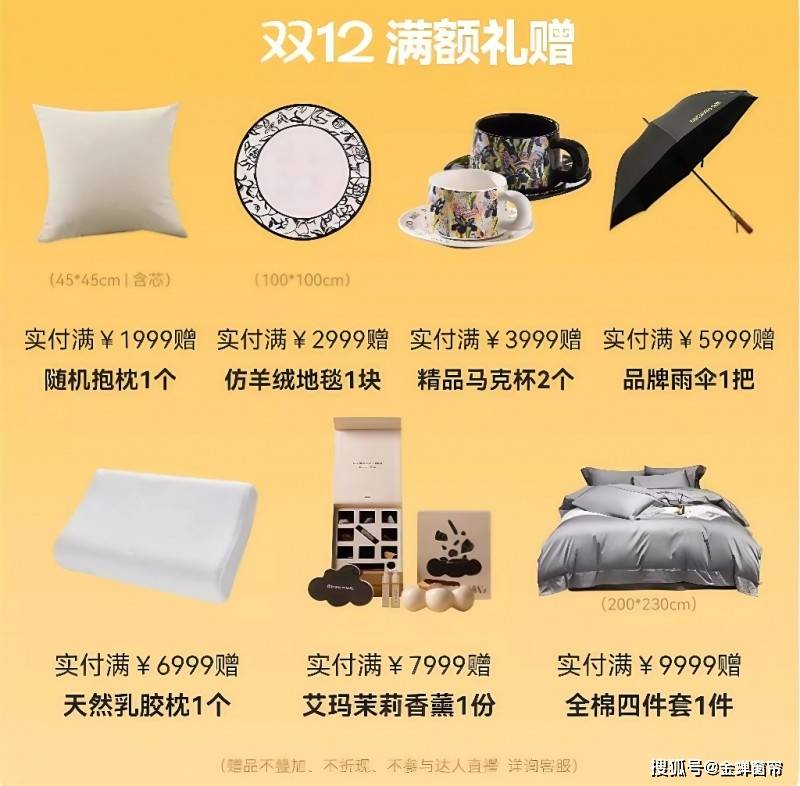 为了更好地回馈消费者,这个双12金蝉窗帘买得越多,送得越多:实付满1999元赠随机抱枕1个,满2999元赠仿羊绒地毯1块,满3999元赠精品马克杯2个,满5999元赠品牌雨伞1把,满6999元赠天热乳胶枕1个,满7999元赠艾玛茉莉香薰1份,满9999元赠全棉四件套,从实用小件到家居好物全覆盖。