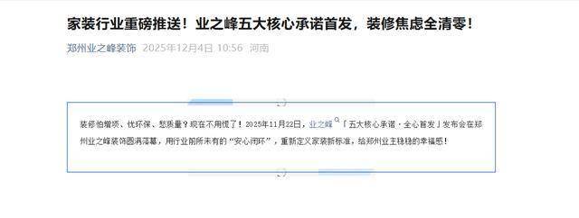 乐居财经李兰 12月4日,据郑州业之峰装饰微信公众号,业之峰在郑州举行“五大核心承诺·全心首发”主题发布会,宣布推出涵盖价格、环保、质量、意外及服务五大维度的系统性保障承诺,旨在通过标准化服务闭环应对家装行业常见消费痛点。