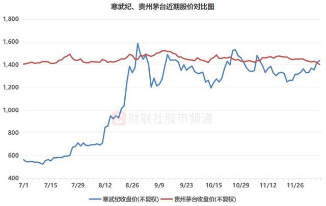 注:寒武纪、贵州茅台近期股价对比图(截至12月9日收盘)