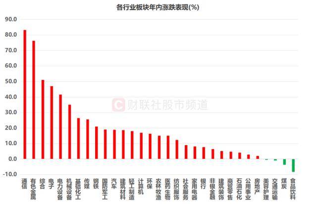 今年以来,市场整体迎来拉升,按行业板块来看,31个申万一级板块中,共有27个板块年内收涨,“红盘率”接近87.1%。其中,通信、有色金属、综合、电子、电力设备板块位列前五名,年内分别上涨83.1%、76.2%、51.1%、47.0%、41.6%。而食品饮料、煤炭、交通运输、美容护理板块年内录得收跌,尤其是食品饮料板块,年内跌幅唯一超8%。