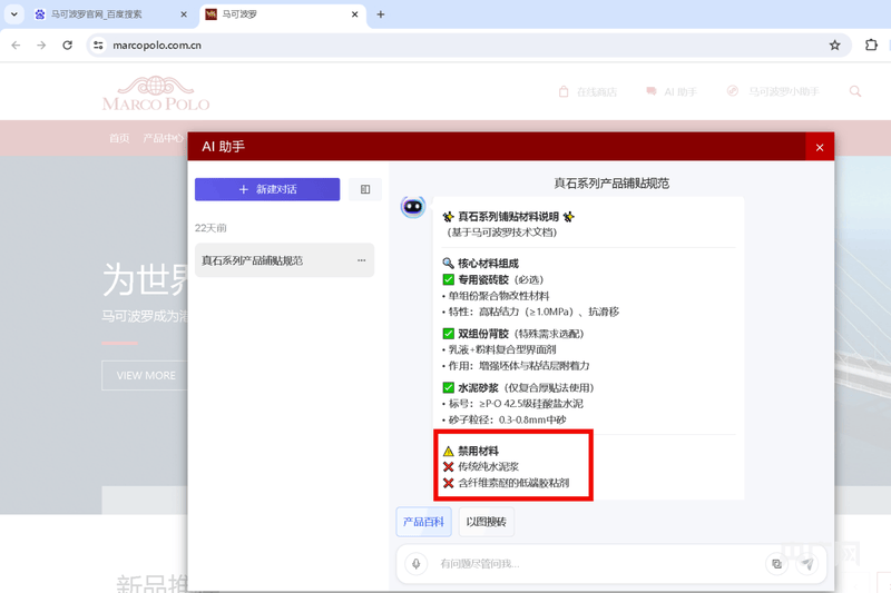 马可波罗瓷砖官网对真石系列产品铺贴规范的说明(央广网发 受访者供图)