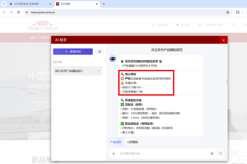 刘先生说,起初,他未怀疑瓷砖质量或铺贴工艺问题,但问题始终反复且愈发严重。后其向马可波罗瓷砖官网智能客服咨询得知,此类“真石系列”瓷砖不能用纯水泥砂浆铺贴,必须使用“胶泥”(瓷砖粘结剂)。