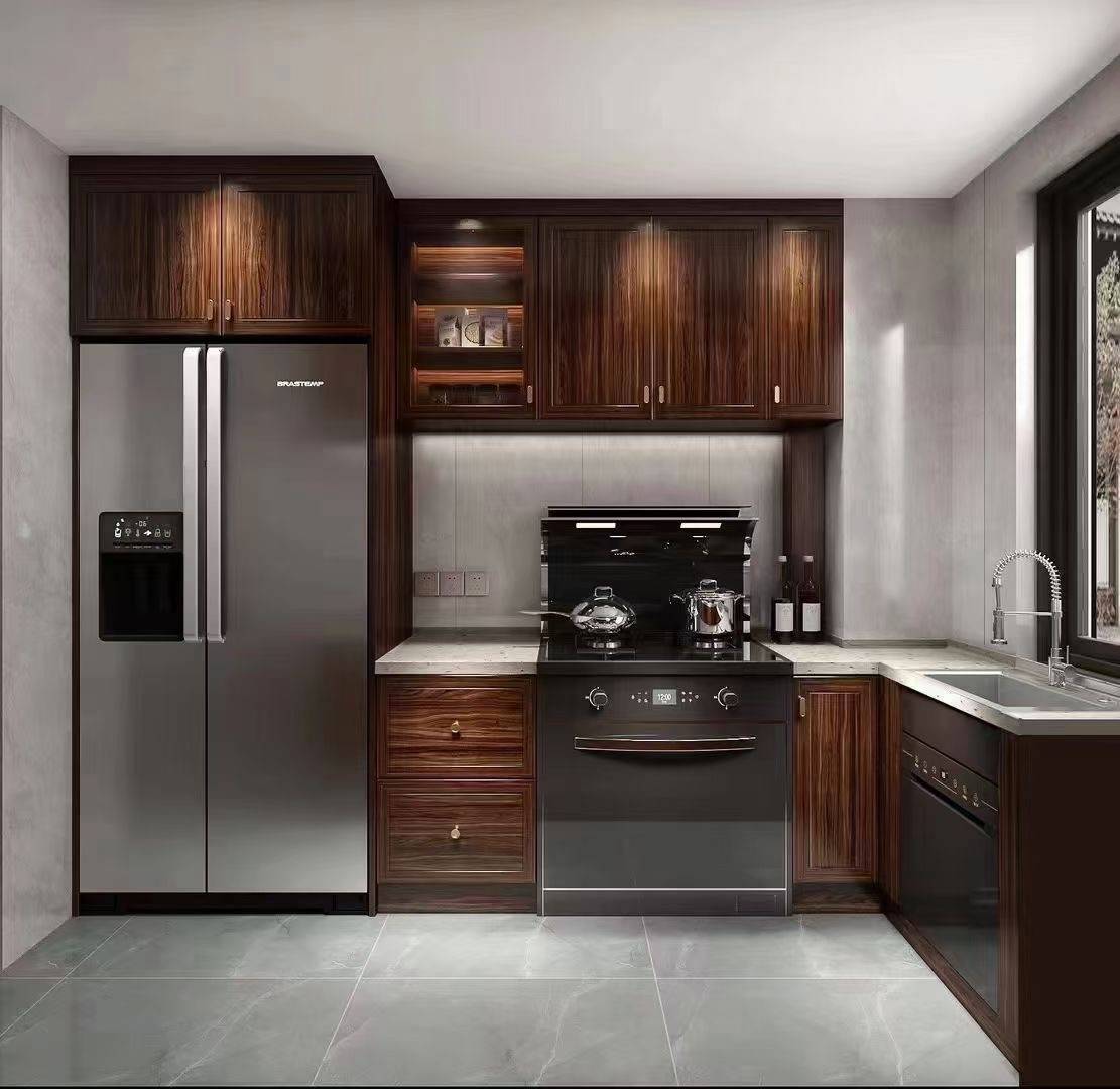 实木橱柜具有独特的优势和特点。从材质上看,它选用天然实木,如黑檀木、乌金木、北方老榆木、胡桃木等。这些优质实木不仅质感温润,给人一种自然、温暖的感觉,而且坚固耐用,使用寿命长。在环保方面,实木橱柜明显优于其他材质的橱柜。一些正规企业采用环保漆工艺,像三木家具就采用了这种工艺,其产品通过中国环境标志产品认证(十环认证),甲醛释放量远低于国家标准,能为家人创造一个健康的厨房环境。