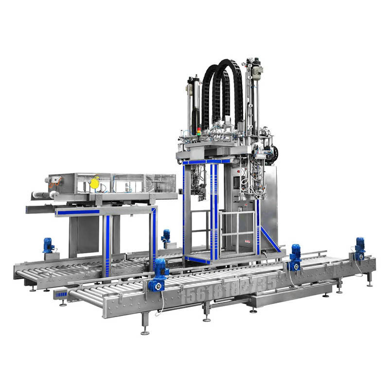 设备自动将空桶输送到充氮区进行灌前充氮,充氮结束后,动力滚筒将包装桶输送至灌装区进行灌装,灌装结束后,自动将滿桶输送至上盖区进行灌后充氮并自动上盖,后端可模块化配置自动贴标机,自动码垛机。