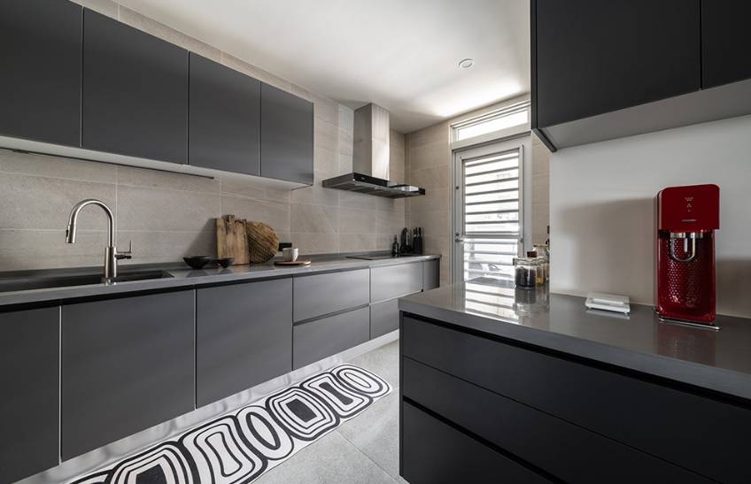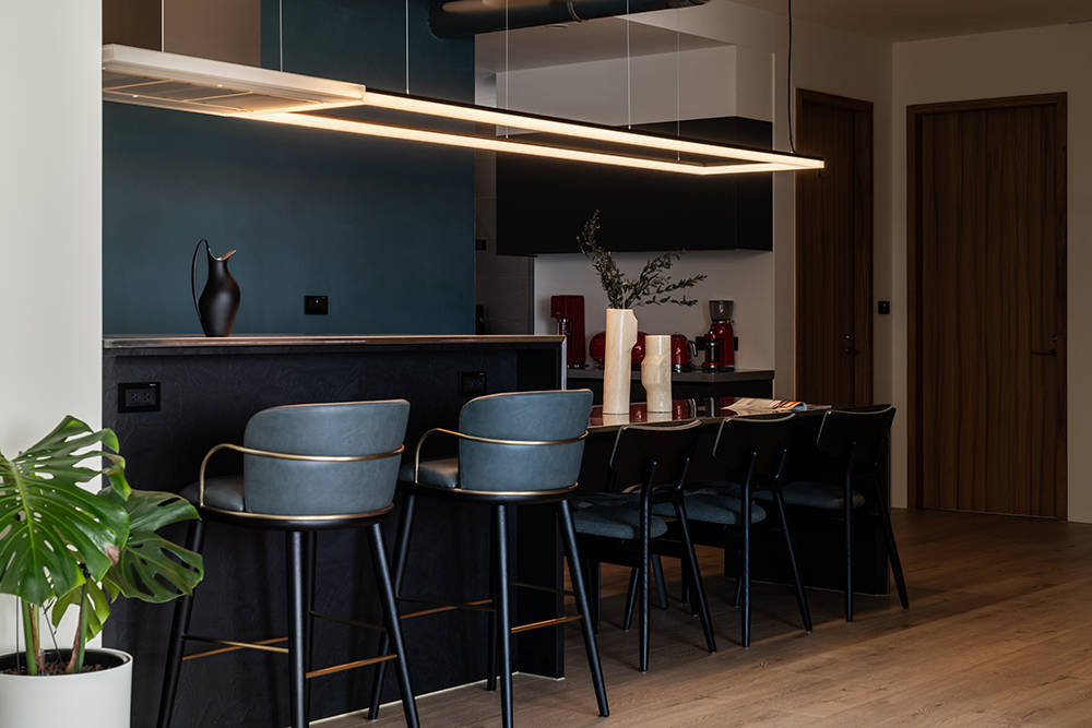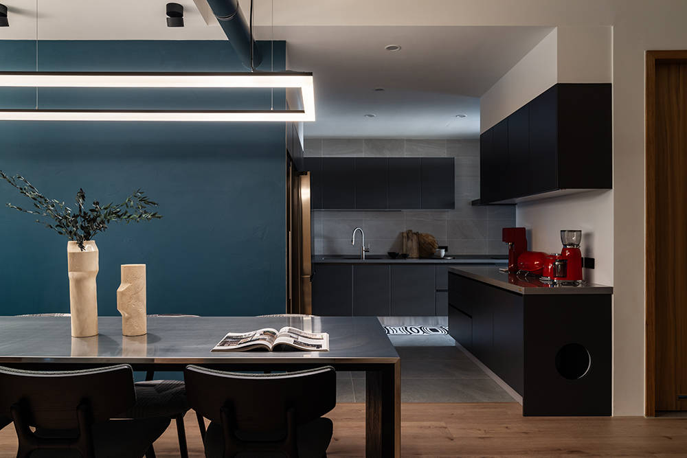 为使保有余裕的厨房空间,不多作隔断,让L型动线仍有内外之分,顺随日常使用流向,打造了红酒柜、电器柜,完备储纳机能,便于访客聚餐之用。