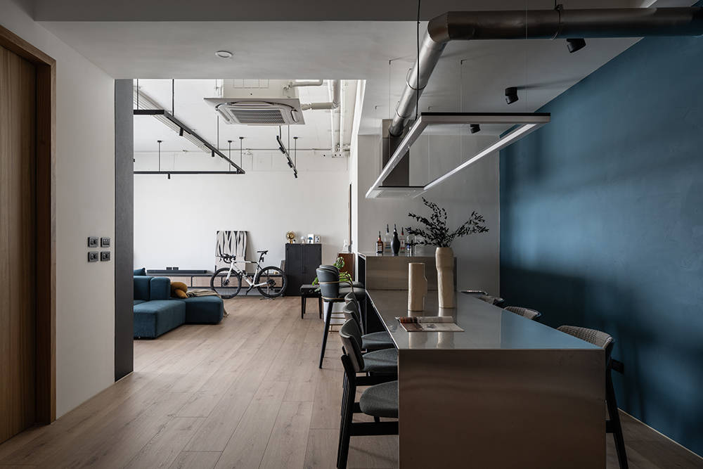 除了排烟管,还可以看到裸现一台商用冷气,达到四方吹冷效果,强效机能也得以让客餐厨三域互动性更高。