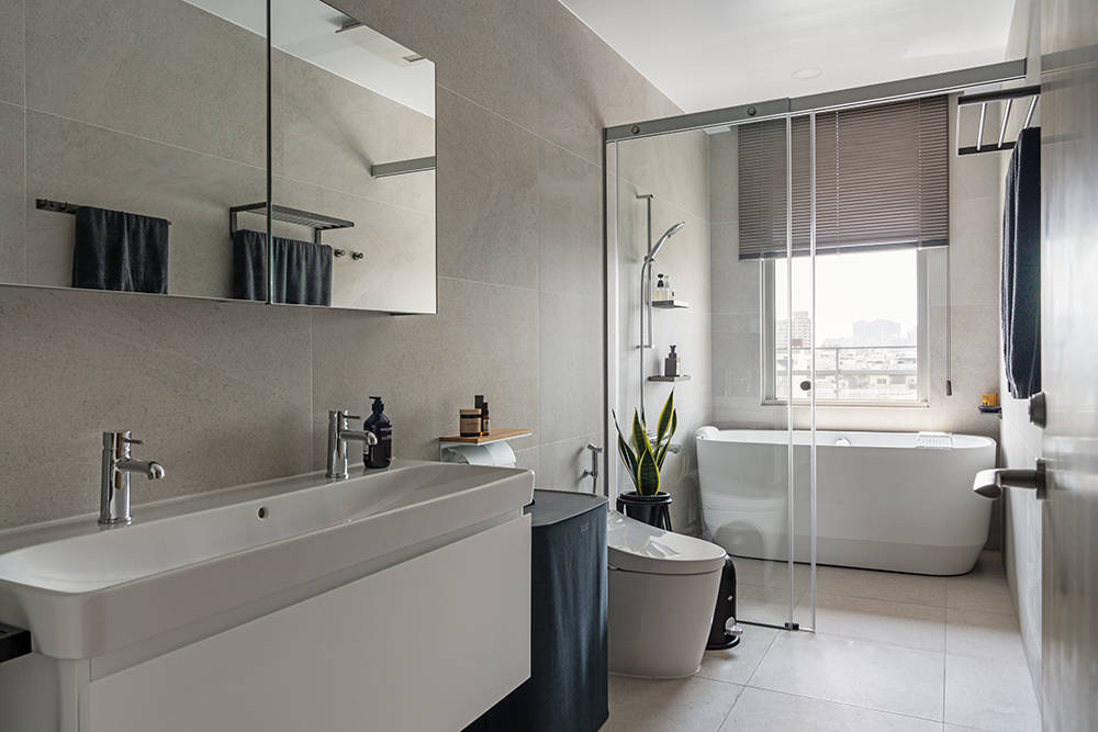 主卫为一字形动线,在临窗侧,采光充沛区域,配置了浴缸,并以玻璃门划分湿区,不仅洗沐能享受阳光浸润,也让湿区获得较好的除湿效果,并引挹单槽式双面盆,利落线条提升整体舒适度。