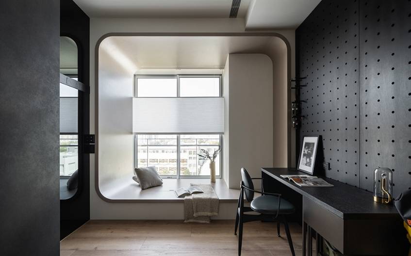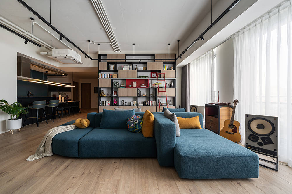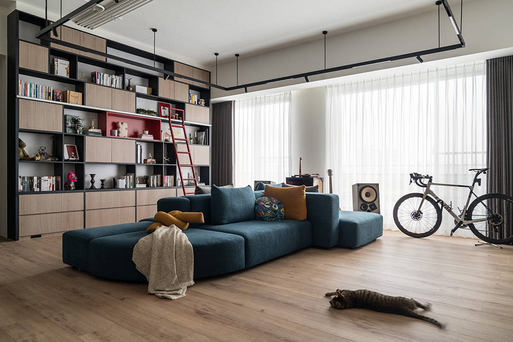 书墙展示了书籍、照片、艺术品之外,侧旁更摆放了钢琴、音响、自行车等物件,让家人爱好的兴趣全然呈现于外,描摹了真实生活感,一展家人齐聚的日常画面,再藉由无定向休闲沙发座椅,每一家庭成员都能时时随心活动,化显最亲近心的底蕴。
