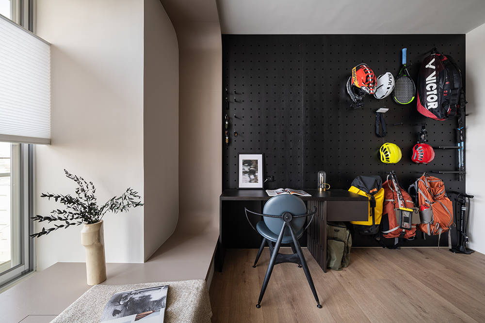 一反常见柜体收纳方式,打造整面洞洞板墙,恰好满足收储户外活动的配件,像是背包、安全帽、灯具、球拍、登山杖等,尽显专属于己的独特风格。