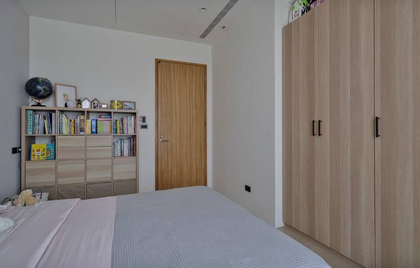 为了让小孩房拥有极高使用弹性,仅以浅底调漆料作为床背墙,不加以施作太多层柜,推升日后随着成长阶段,可量身订制需求,并由原木衣柜注入温和柔质感。