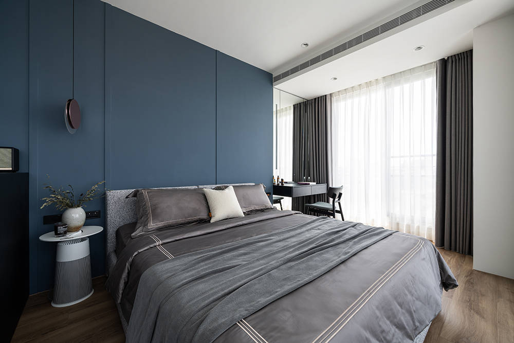 卧眠区与更衣室以开放式规划,予以深色底调为衣柜柜面,为了平衡冷冽感受,床背墙以一抹蓝面木作为墙,再简单勾勒线板收边,让全室交融了层次之美,多些温润美感。