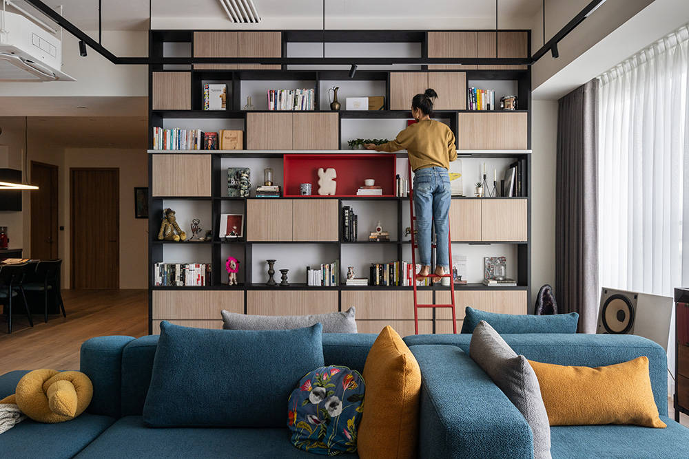 原本将木纹与深色造型层架,以一虚一实的节奏,表现出韵律性,但女主人盼望加入活泼感,以不纯粹造型表现灵动姿态,便注入了红色柜体,瞬时浮现为一笔亮点,再摆置一把红色梯子,完美加深了人与书墙的互动。
