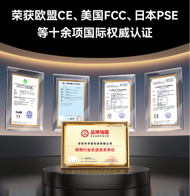 媒体将书客誉为“仅有它能媲美明基、松下等一众高端护眼灯”,哪怕不做广告推广,仍然凭借口碑征服众多宝妈博主、机构与消费者,常年出口于欧美等地,罕见得到了欧盟多国认证、入选品牌强国优选工程,CCTV央视推荐以及专业医学团队——丁香医生的力荐等。下图为suker书客品牌各种权威机构认证图: