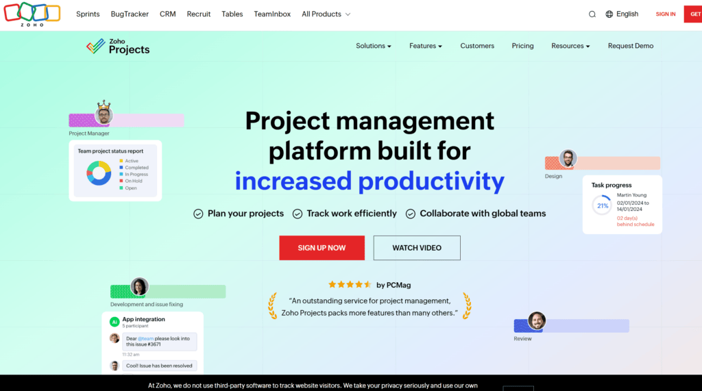 Zoho Projects 支持任务拆分、甘特图进度管理、团队讨论、文档协作、时间记录等能力,使项目经理能够系统化管理工程周期。对于项目较多、需要跨部门协调设计师、采购人员、施工人员的装修公司来说,它能帮助建立稳定的沟通机制。