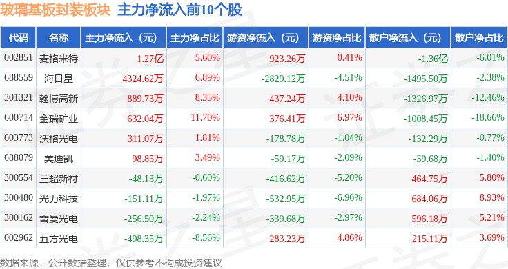 从资金流向上来看,当日玻璃基板封装板块主力资金净流出5.73亿元,游资资金净流出1.2亿元,散户资金净流入6.92亿元。玻璃基板封装板块个股资金流向见下表: