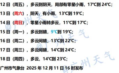 14日,粤北和珠三角北部市县阴天转多云到晴天,粤西市县阴天间多云有分散小雨,其余市县分散小雨转多云。最低气温:粤北和珠三角北部市县4~8℃,南部沿海市县13~15℃,其余市县9~12℃。