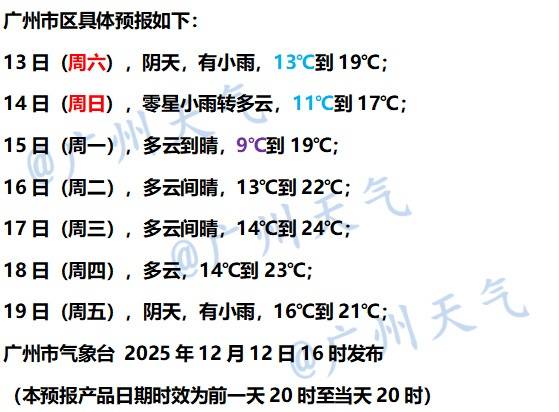 广州市气象台预计,12月13日上午起中等偏强冷空气自北向南影响广州,中午前后到达市区,下午到达南部,各区气温先后持续下降并伴有小雨,北部局部中雨,日平均气温下降5~8℃;过程最低气温出现在12月15日早晨:北部7~9℃(山区4~5℃),中部9~11℃,南部11~13℃。12月13日—14日陆地阵风将加大至5~7级,广州港区和高地阵风加大至6~8级,局地9级。