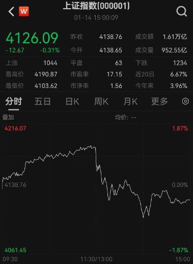 2026年1月14日,沪深北交易所午间宣布提高融资保证金比例,A股三大指数午后高位跳水,上证指数最终收跌0.31%至4126点。A股全天成交额超3.98万亿元,连续第三个交易日刷新历史纪录。