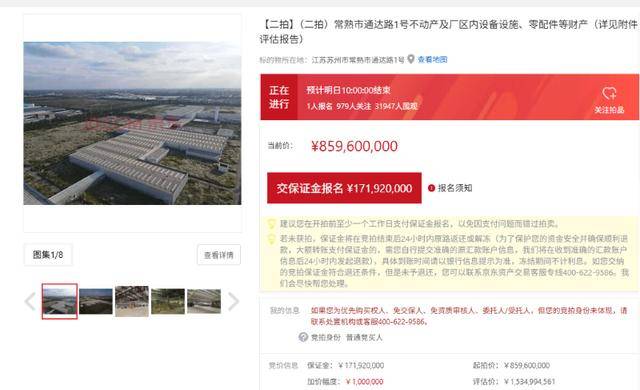 1月15日上午,姚振华实名举报涉及的观致汽车位于常熟的核心资产已在京东司法拍卖平台准时开拍。截至下午5点,此次拍卖只有1人报名。拍卖的起拍价格8.596亿元,该资产评估价格约15亿元,竞价周期为1天。
