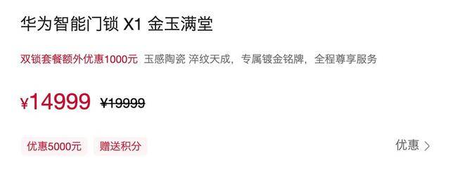 1 月 16 日消息,华为官方商城上架了一款全新的智能门锁——华为智能门锁 X1 金玉满堂,标价 19999 元,目前到手价 14999 元。同时华为还推出了双锁套餐,两台 X1 金玉满堂到手价格为 19999 元。