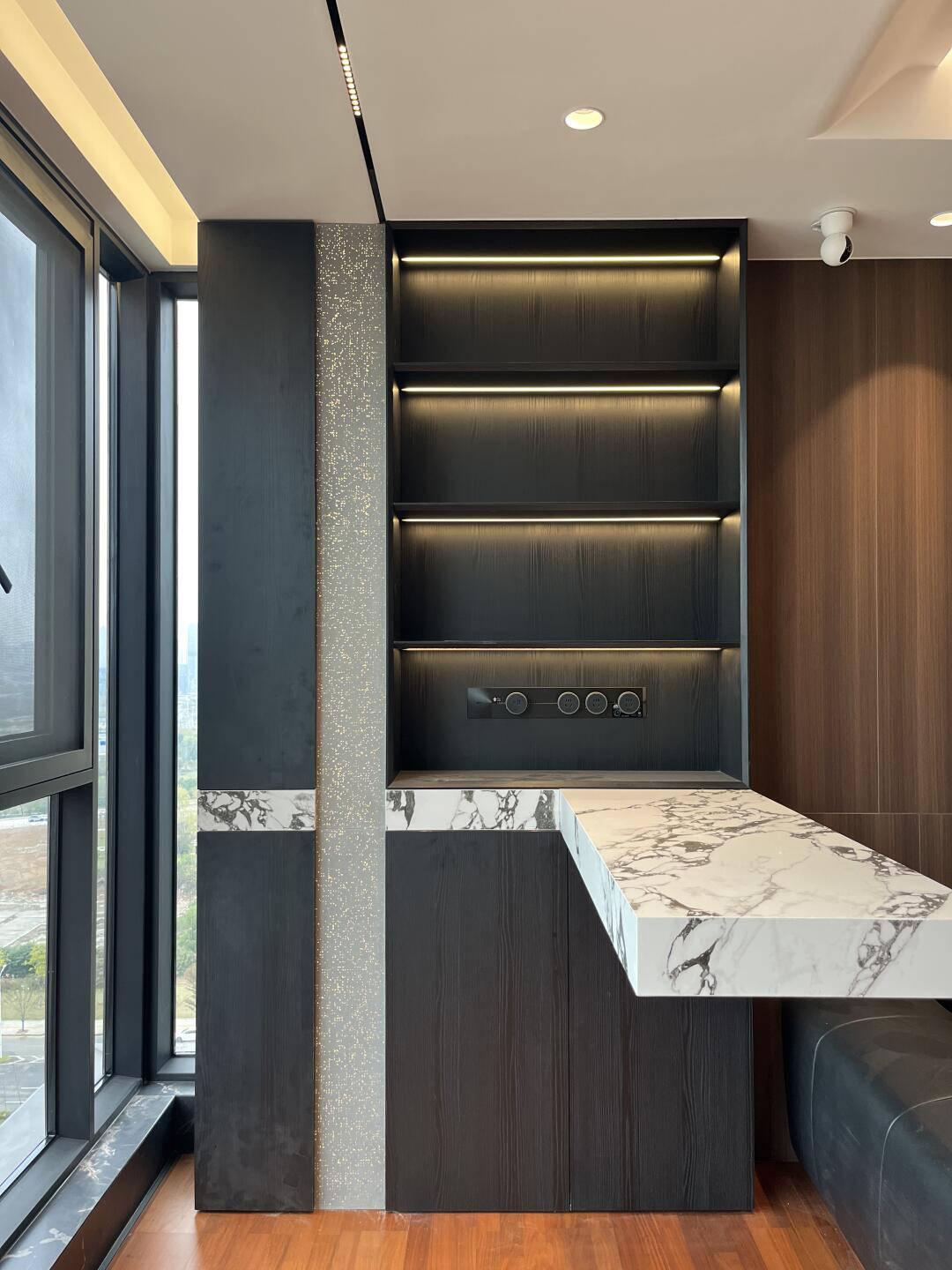 其次,全屋定制能满足消费者的个性化需求,包括风格、色彩、材质等方面。无论您喜欢现代简约风、新中式风还是意式轻奢风,都能找到合适的设计方案。如廊坊香河120㎡三居改善房,采用新中式风设计,玄关的换鞋凳+顶天立地柜,下层留空放老人拖鞋,中层开放格摆茶具,福港橡胶木纹理契合新中式韵味,兼顾了老人的储物习惯与年轻人的审美。