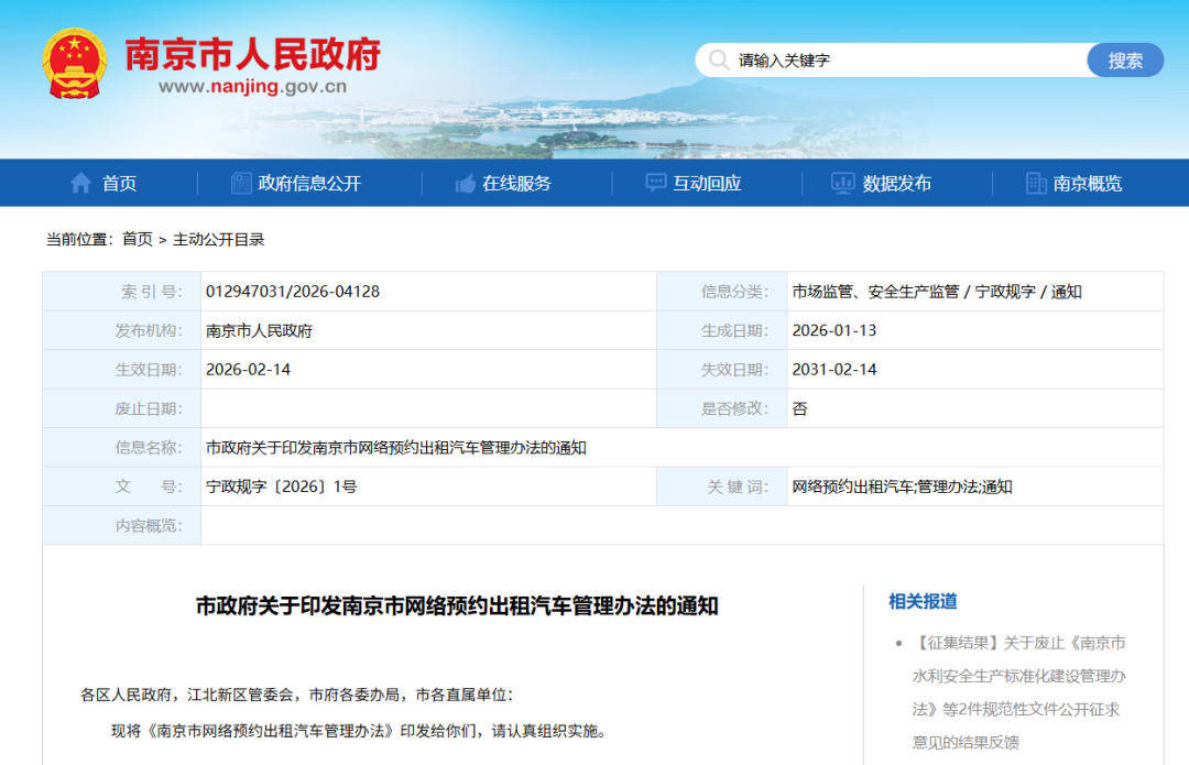 1月16日,南京市人民政府官网正式发布《南京市网络预约出租汽车管理办法》。该《办法》自2026年2月14日起施行,有效期至2031年2月13日。这是自2017年首版网约车管理办法实施以来,南京市首次对该政策进行系统性修订,旨在适应行业发展新形势,进一步规范市场秩序,保障各方合法权益。