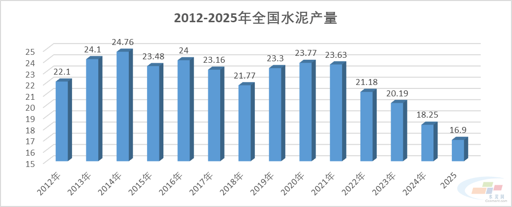 近年来,国内水泥市场需求持续下滑,到2025年国内水泥产量较2014年历史最高峰的24.76亿吨减少约7.86亿吨,跌幅约31.74%。