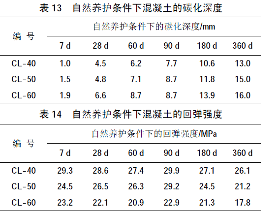 标准养护、自然养护条件下混凝土的抗压强度如表11、表12所示,自然养护条件下混凝土的碳化深度、回弹强度如表13、表14所示。