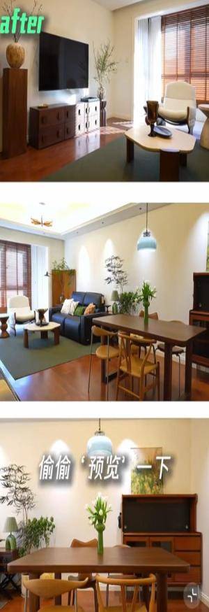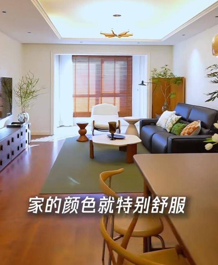 这次翻新后,吕一家里整体走的是原木加法式混搭风,客厅打通后开阔了很多,定制的收纳柜摆满墙面,餐厅的桌椅还是以前那套,看得出来她挺会过日子能继续用的家具就不浪费;
