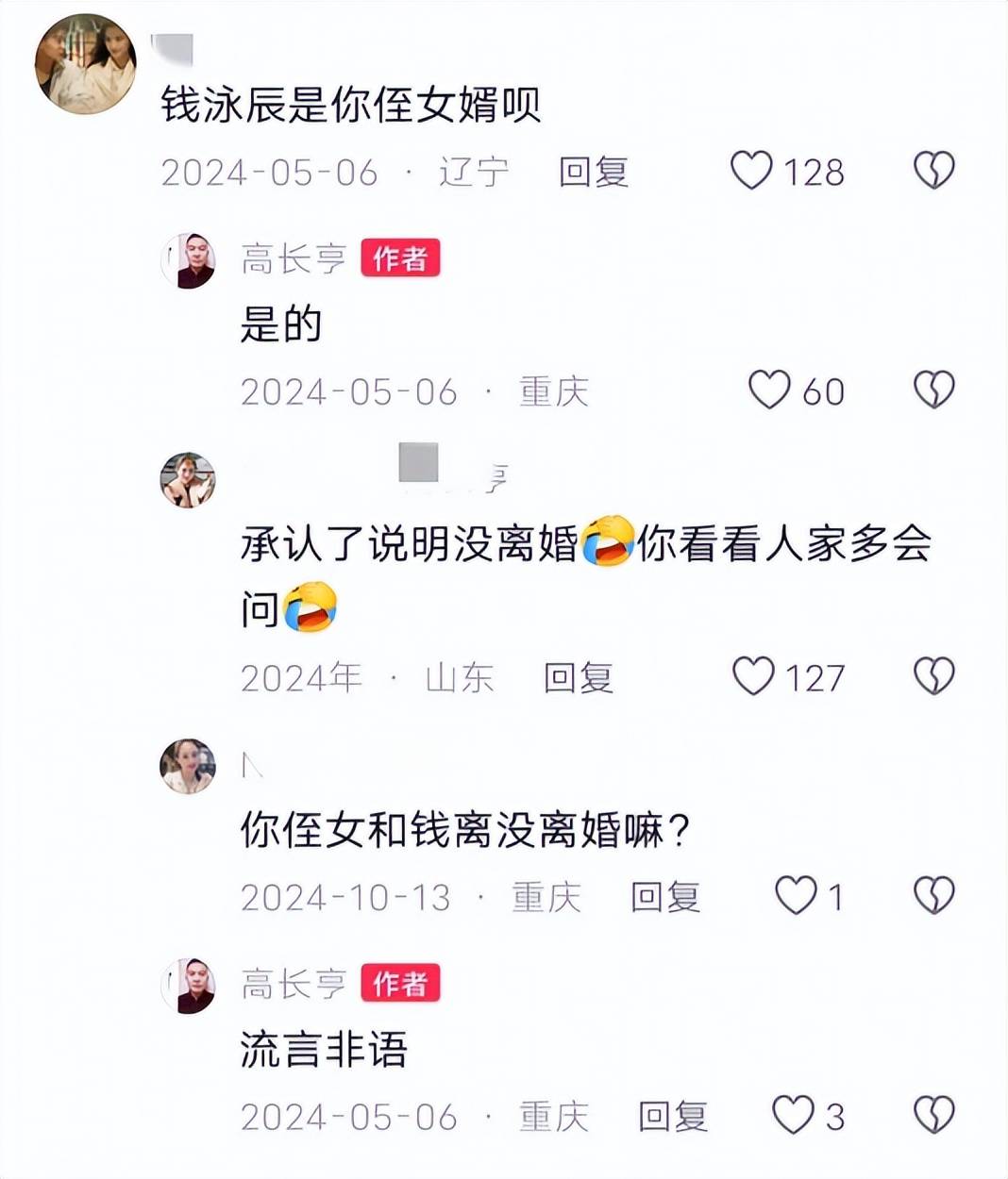关于两人的婚变传闻,去年10月还有网友特意跑到吕一表舅的评论区询问两人的婚姻状况,表舅当场回复婚变传闻是流言蜚语 ,还强调钱泳辰依然是自己的侄女婿。